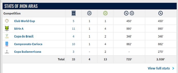 Lịch sử ghi bàn trong 5 trận gần nhất của Jhon Arias (Ngôi sao của đội Fluminense)